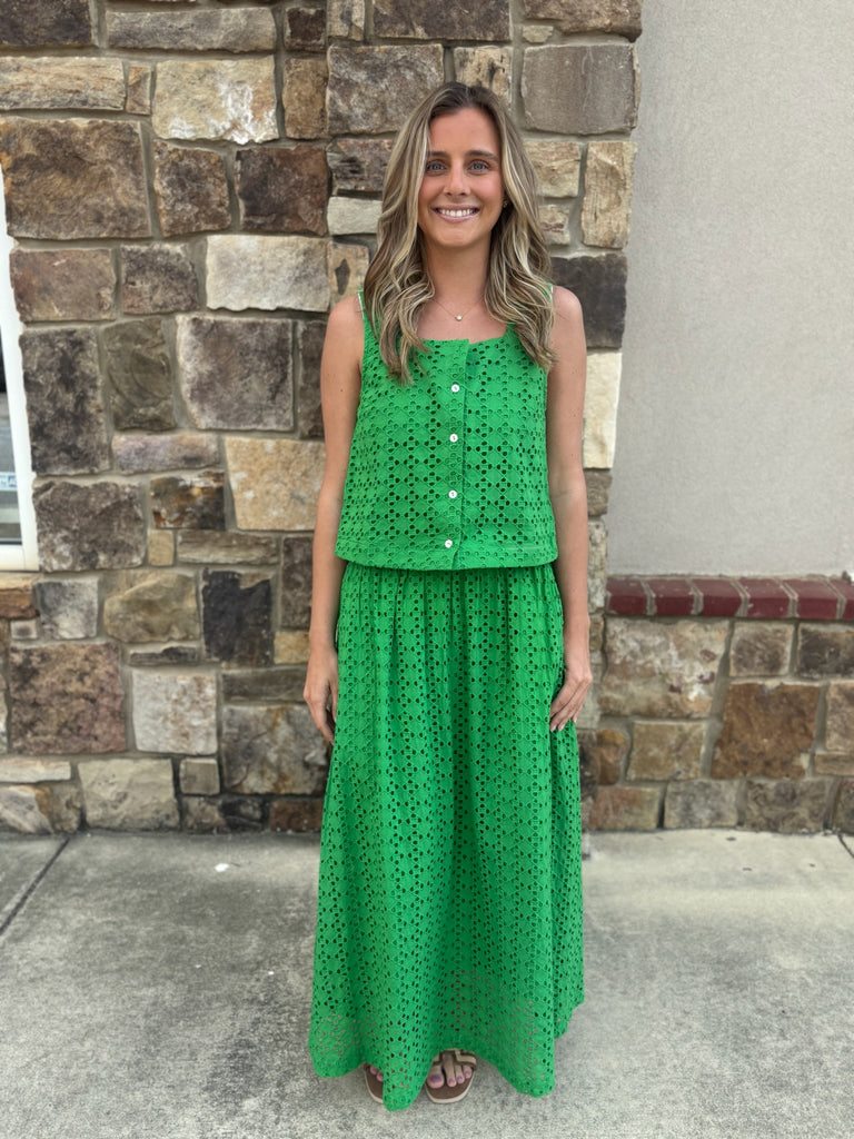 Elevate your spring wardrobe with this charming green eyelet skirt. Crafted with delicate eyelet detailing, it's perfect for warm-weather styling. Pair it with the Daisy Tank to create a coordinated, effortless look that's ideal for casual outings or weekend adventures. The airy design keeps you cool while the timeless green hue works with any season.