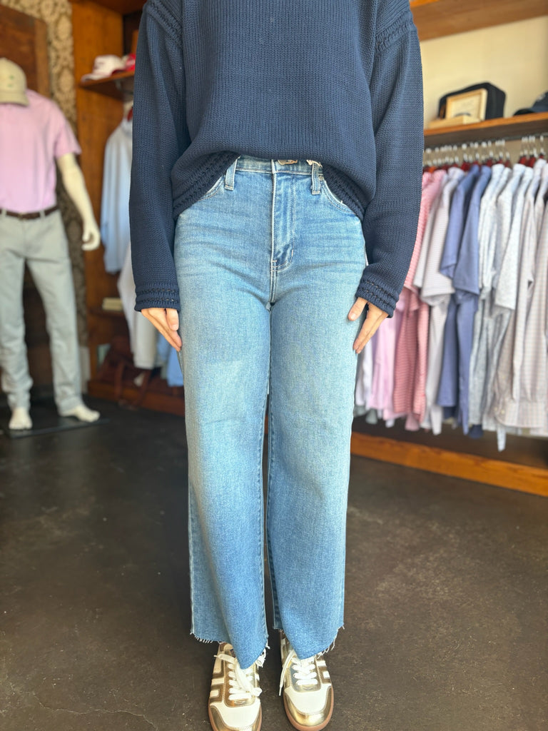 Rock that effortless cool with our Medium Denim Scissor Cut Wide Leg Jean. The edgy scissor detailing adds instant personality while the relaxed wide-leg silhouette keeps things comfortable and on-trend. Perfect for pairing with everything from crop tops to oversized tees, these jeans are your new go-to for making a statement without trying too hard. Timeless denim with a modern twist that'll have you feeling confident all day long.