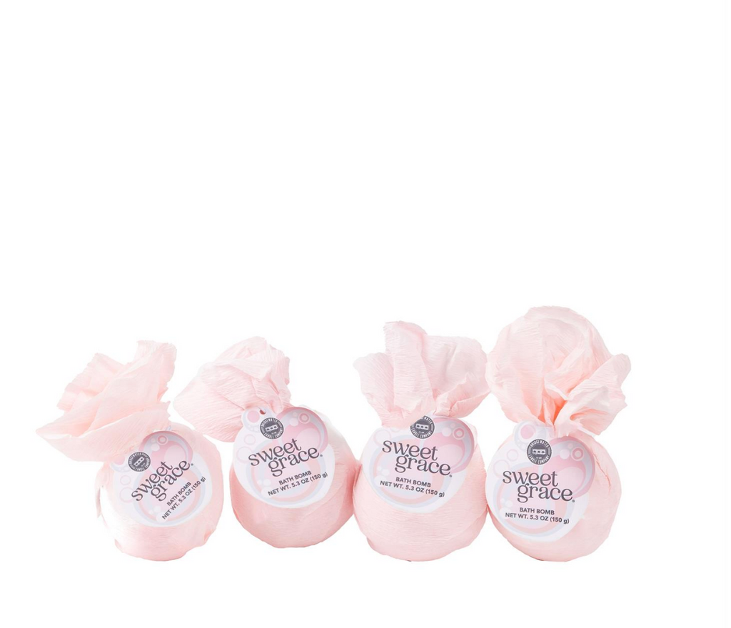 Splish Splash Sweet Grace is taking a bath! Now you can literally bathe in Bridgewater's #1 best-selling fragrance, Sweet Grace. Our new bath bombs are 5.3 oz of heavenly bliss and tons of fizzy fun. Simply drop the scented bath bomb in your bath tub and enjoy a sweet escape. This fragrance is filled with notes of passion fruit, sparkling tea, and classic patchouli. Shade of pink may vary. Bath bomb is 2.5" in diameter, shrink-wrapped, and packaged in lovely pink tissue paper. Sold individually.