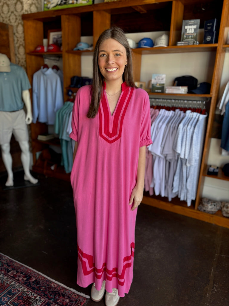 The Sloane Dress is a striking hot pink short sleeve maxi that commands attention with bold red detailing throughout. Perfect for making a statement at summer events, casual outings, or whenever you want to feel confident and vibrant. The flowing maxi silhouette offers comfort and elegance, while the contrasting red accents add visual interest and dimension. An easy-to-wear piece that transitions seamlessly from day to evening.