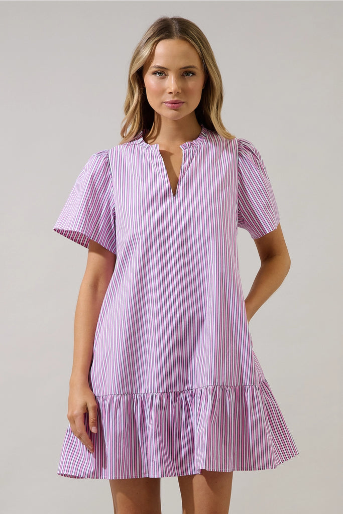 Classic stripes meet an easy, feminine silhouette. This pink striped mini dress features a split neckline, soft short sleeves, and a relaxed fit. Finished with a subtle ruffled hem, it’s the perfect throw on style for everyday wear.