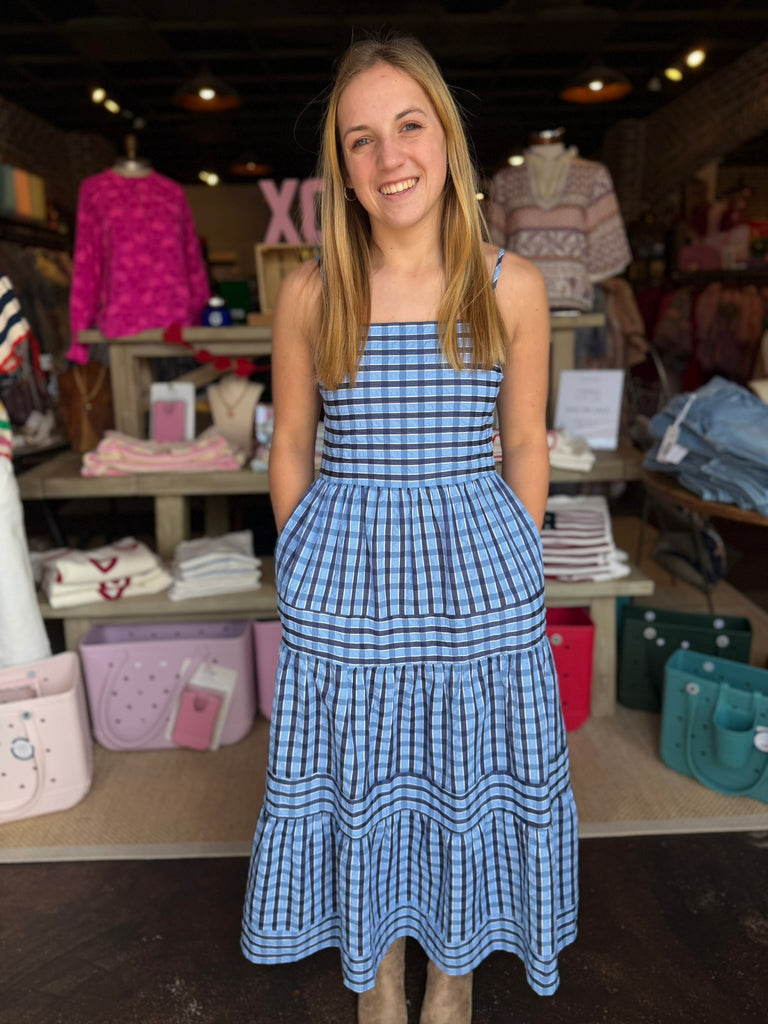 Elevate your wardrobe with the Stacee Dress, a timeless gingham maxi that seamlessly transitions from casual days to evening occasions. Featuring a striking sky blue and navy blue gingham pattern, this dress offers classic charm with modern versatility. The flowing maxi silhouette flatters every figure while the crisp gingham print adds visual interest and dimension. Perfect for brunches, garden parties, or relaxed weekend outings, the Stacee Dress pairs effortlessly with sandals, sneakers, or heels. Invest in a piece that combines enduring style with everyday wearability—a wardrobe essential that works as hard as you do.