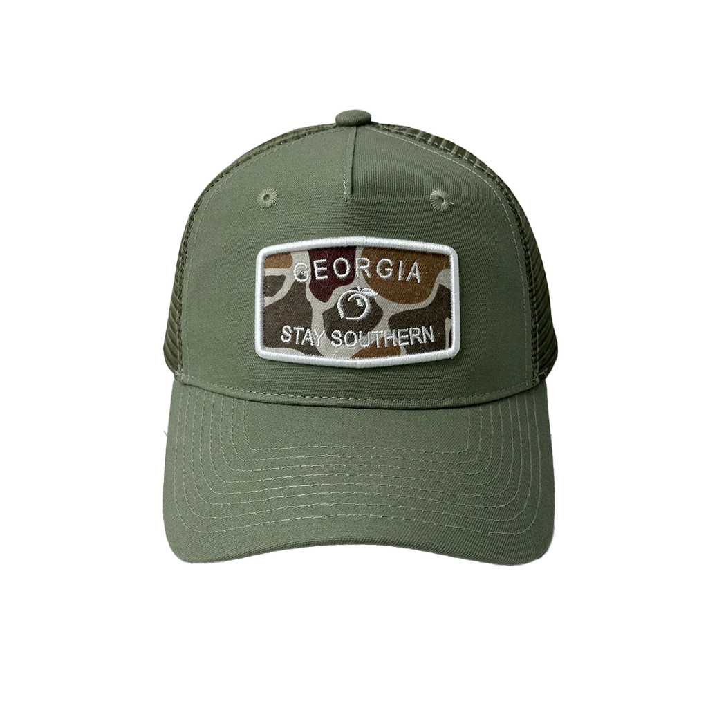 Stay true to your roots with this olive cap featuring a bold old school camo patch that reads 'GEORGIA' and 'STAY SOUTHERN.' Designed with classic Southern pride, this hat is both stylish and comfortable for everyday wear.