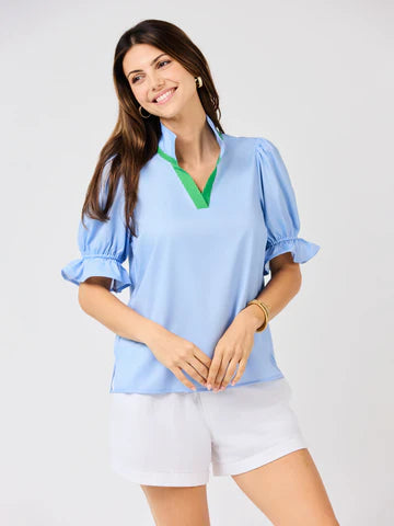 The Jessica Top brings a fresh, modern feel to your everyday lineup. Its versatile pop collar and eye-catching contrast trim add just the right amount of detail, while the slight puff sleeves with elastic and subtle ruffle accents create a playful, elevated shape. Effortlessly polished yet full of personality, it’s a standout piece that instantly pulls any look together.