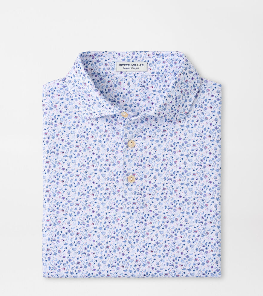 Summer Comfort jersey polos are gold standards for softness and exceptional performance. These are packed with four-way stretch, wicking and UPF 50+ protection in their signature fabrication. This shirt features a custom-designed oyster roast print for added style. Finished with a spread collar and three-button placket.