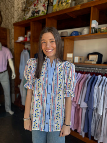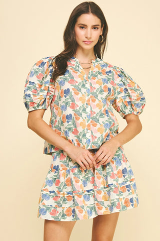 Pink Multi Puff Sleeve Ruffle Neck Top