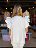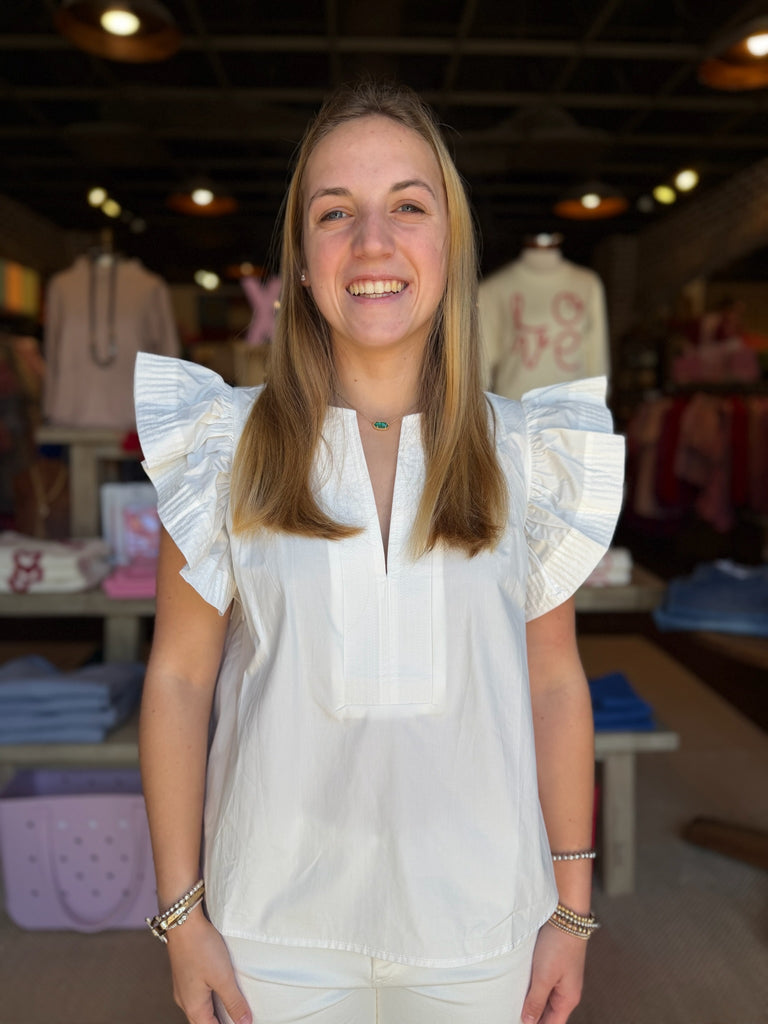 Fluttery, feminine, and effortlessly chic—the Maria Top is your new go-to for warm-weather style. This crisp white short-sleeve tee features delicate flutter sleeves that add a playful touch to an otherwise timeless silhouette. Perfect for casual outings, weekend brunches, or layering under your favorite jacket. Lightweight and breathable, it's the kind of piece that works with everything in your closet.